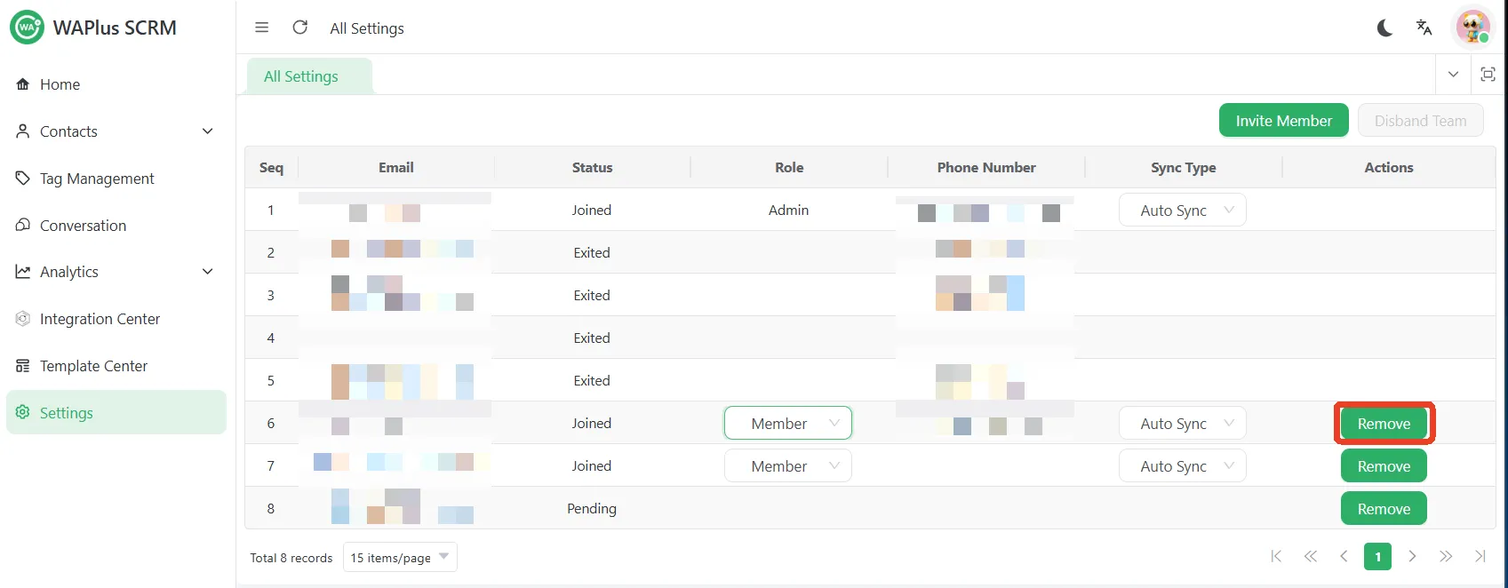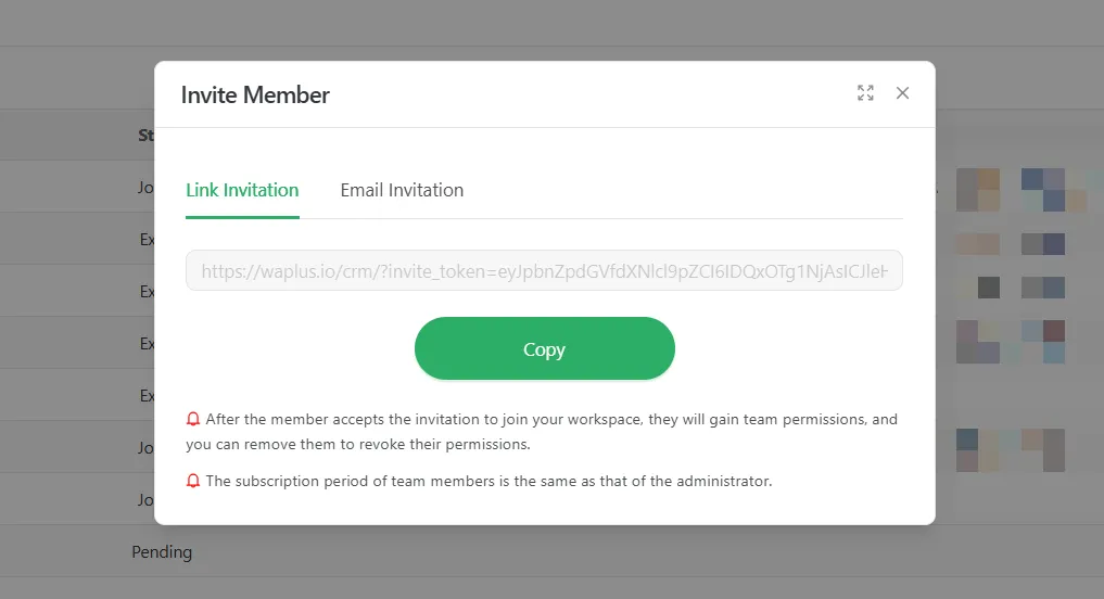 Paso 1:Navega a https://waplus.io/crm/v2/setting y haz clic en Invitar Miembros.